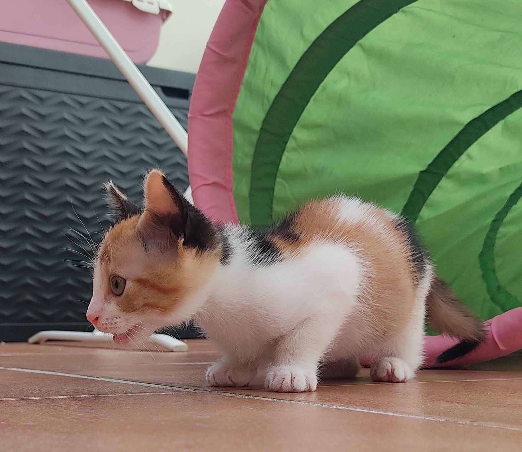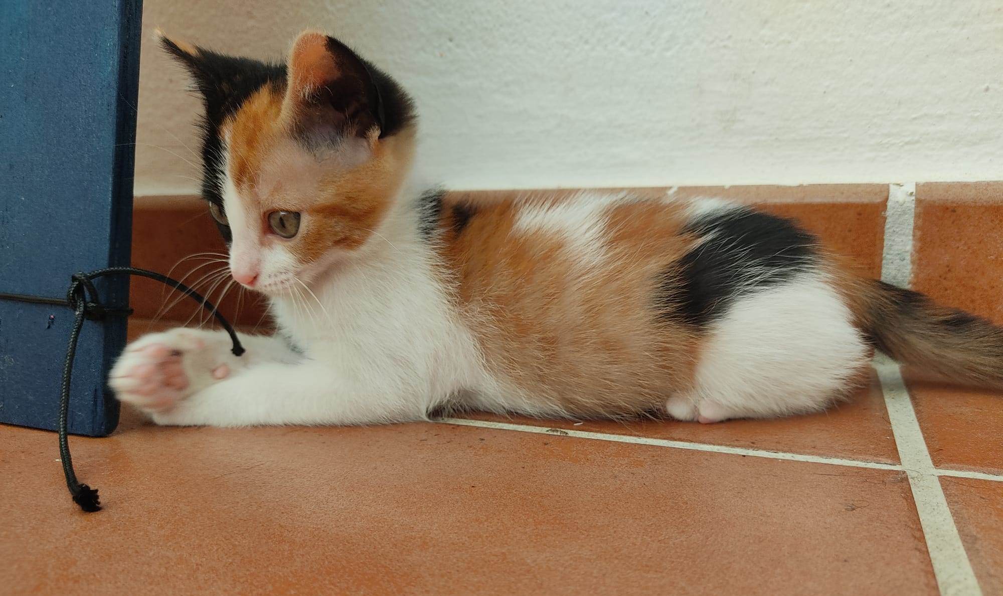 Angelina, este terremoto de gatita, fue encontrada solita en una de las colonias que gestionamos en Punta Candor. Inmediatamente el cuidador se dió cuenta de que era nueva allí, es decir, que alguien, intencionadamente, la había separado de su madre y la había dejado en un lugar peligrosísimo para ella. Tras un par de días en su casa, la llevó al refugio donde conquistó el corazón de nuestra compi Cristina y le ofreció una acogedora casa de acogida junto a Paquito (otro de nuestros bebés gatitos en adopción).