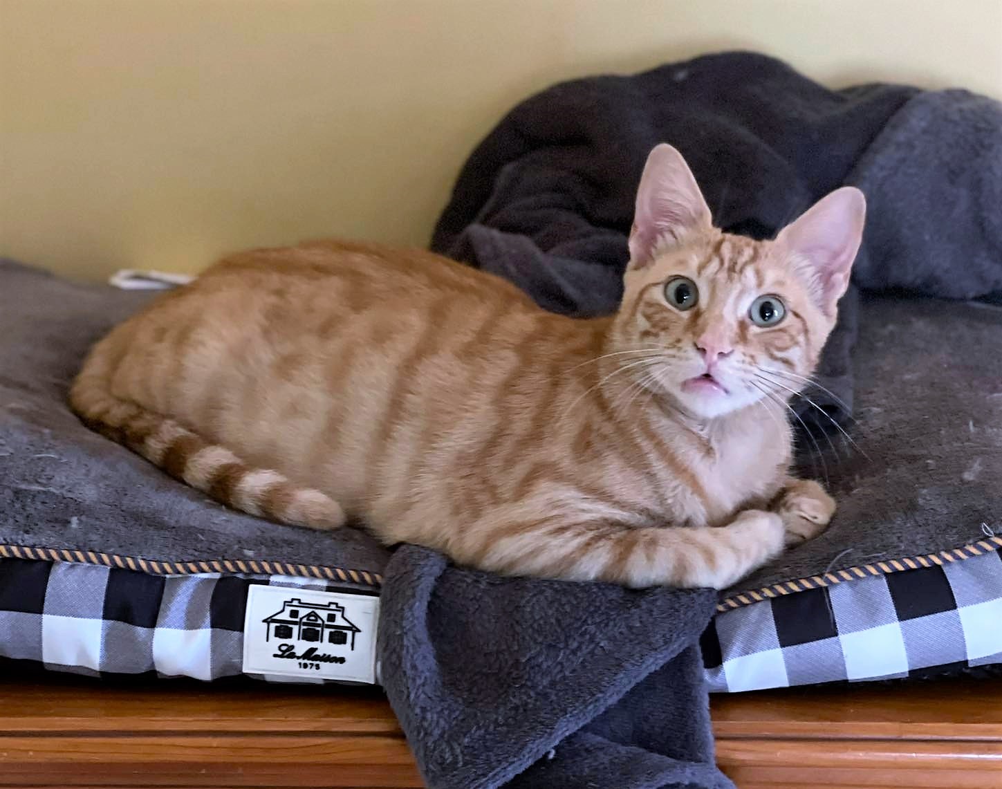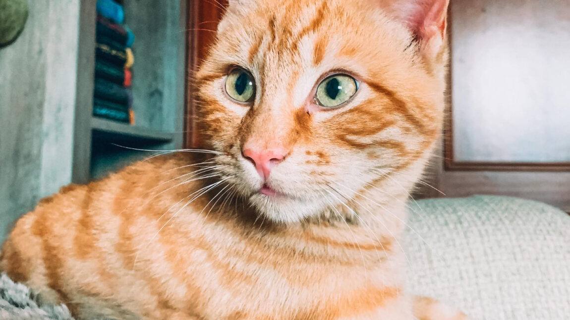 Es un precisoso atigrado naranja, con unos vibrantes ojos verdes ligeramente bizcos. Sociable, cariñoso, llegó con su hermano Jaspar, que encontró un hogar cuando tenían poco mas de tres meses.