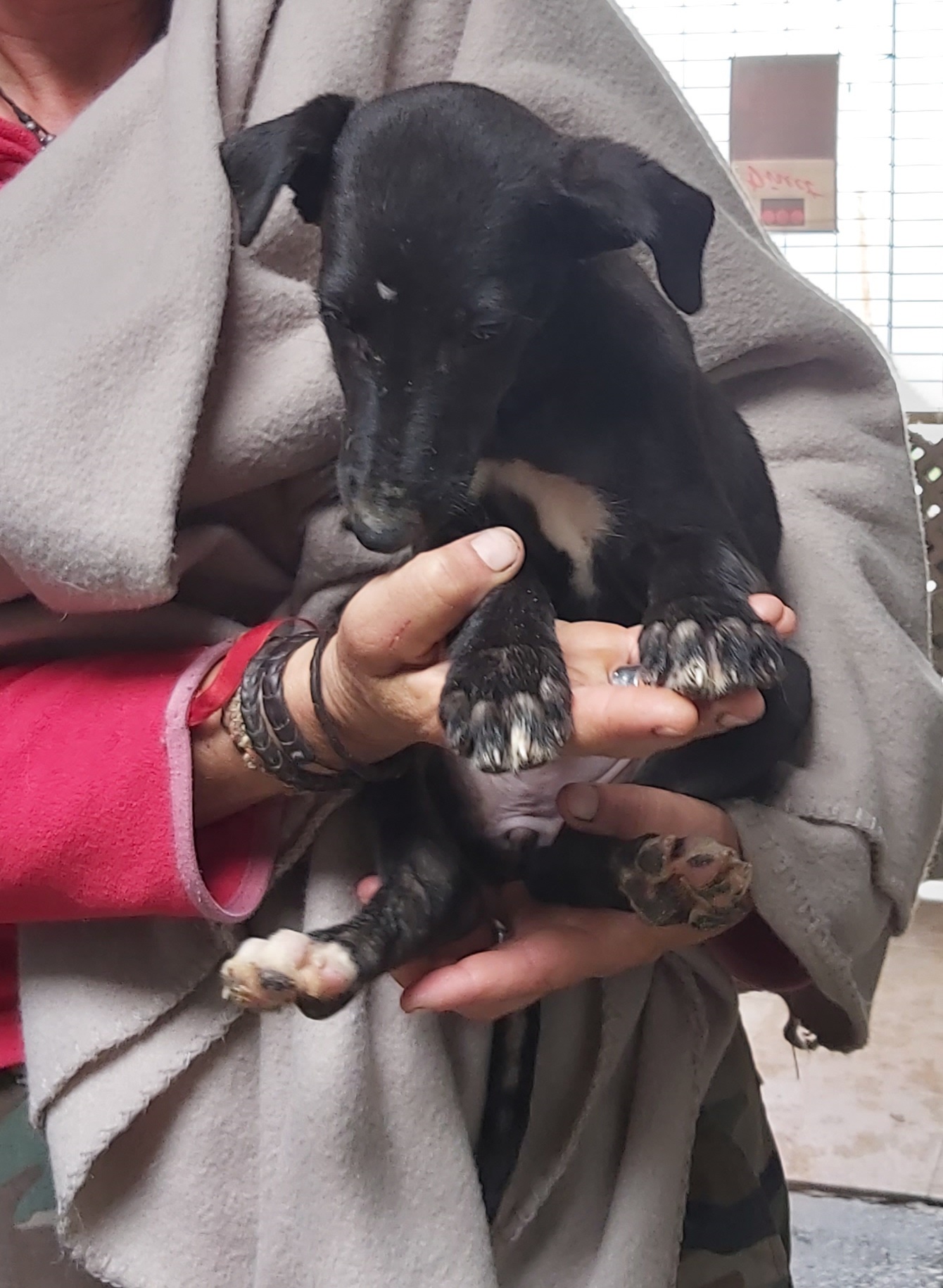Y aquí os presentamos a la cuarta integrante de la última camada de galgos abandonados que nos llegó a primeros de esta semana al refugio. Tres hembras y un macho, todos ellos negros, lo que hará más difícil su adopción, como ya sabéis. Gloria, al igual que sus hermanos, llegó infestada de parásitos internos que podrían haberle costado la vida, además de sucia y mal nutrida. Por suerte a todo ello hemos puesto ya remedio.