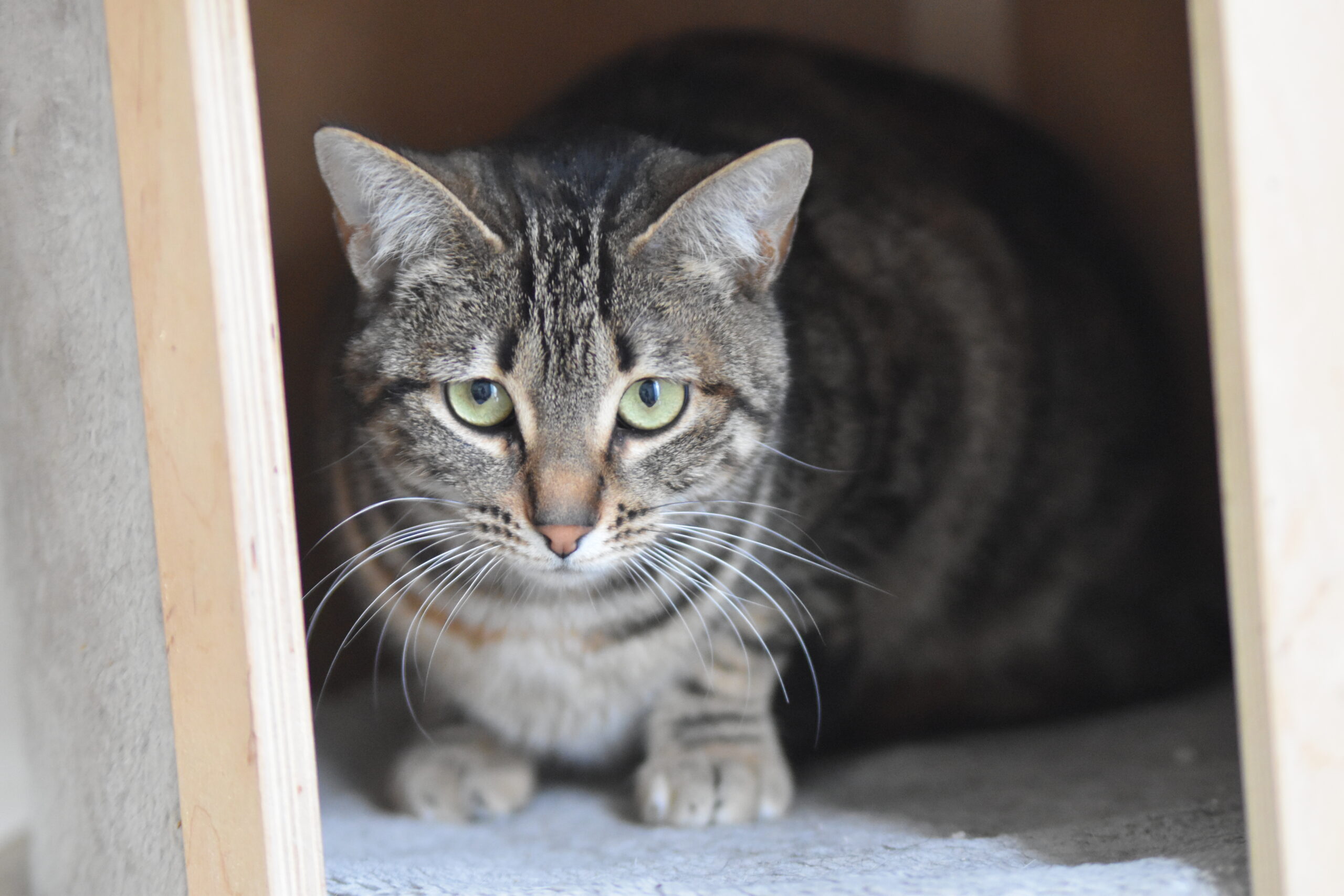 Grace fue encontrada en una colonia local con graves infecciones oculares y fue llevada a un hogar de acogida para tratar sus ojos hasta que estuvo lo suficientemente recuperada para ingresar al refugio. Elvira fue encontrada en una colonia controlada diferente, claramente abandonada, ya que se escondía de los otros gatos. Al principio, le costó adaptarse al refugio con tanto ruido y otros gatos, pero cuando Grace llegó, se acercó a su nueva amiga. Ahora ambas están en un hogar de acogida juntas y están floreciendo lejos del ruido del refugio, listas para encontrar un hogar juntas.
