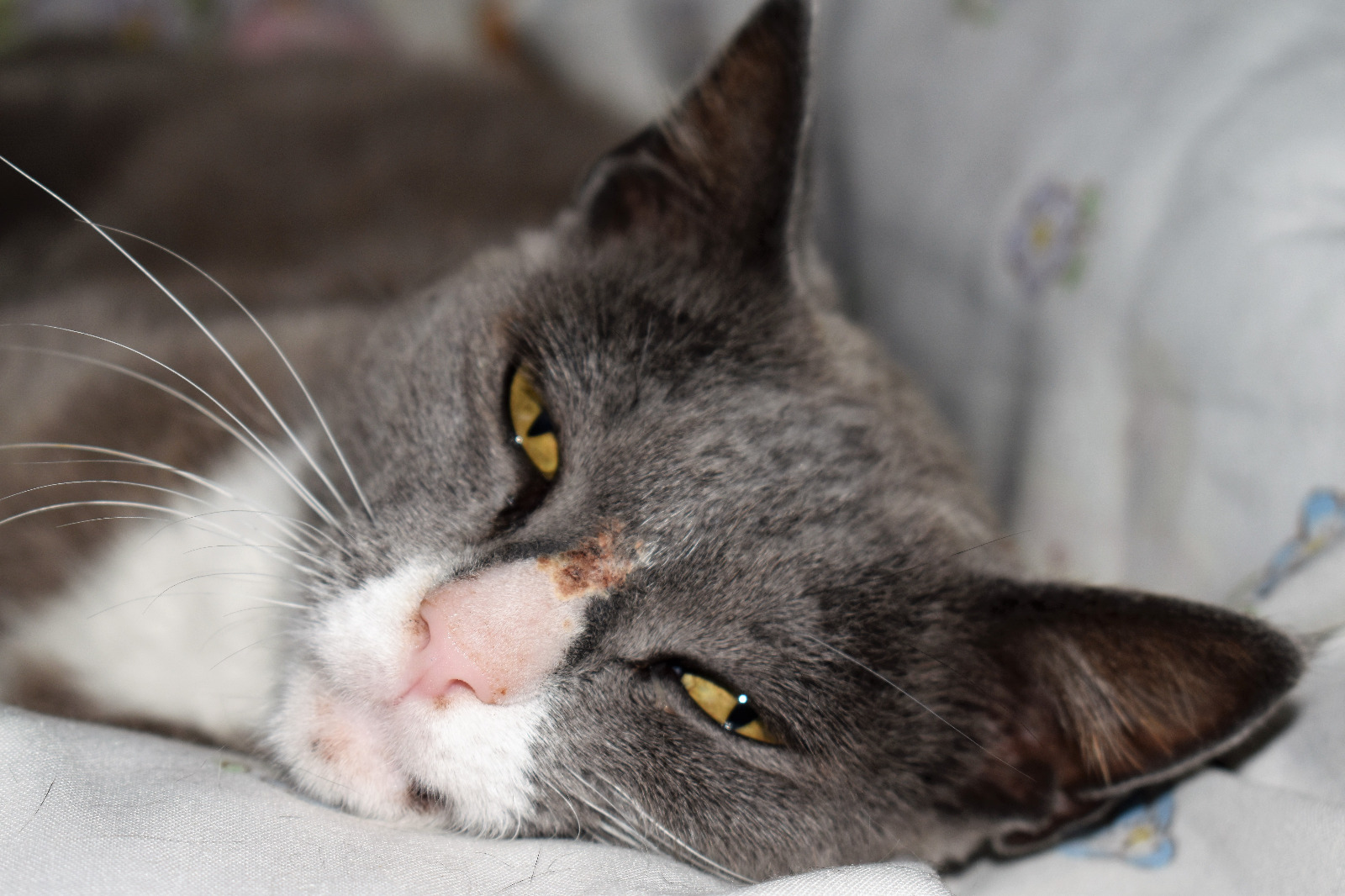 Su historia es triste, la dejaron morir cuando tuvo problemas para parir, pero la llevamos al veterinario y la operaron para salvarle la vida, desafortunadamente ninguno de sus gatitos sobrevivió, la ayuda llegó demasiado tarde para ellos.