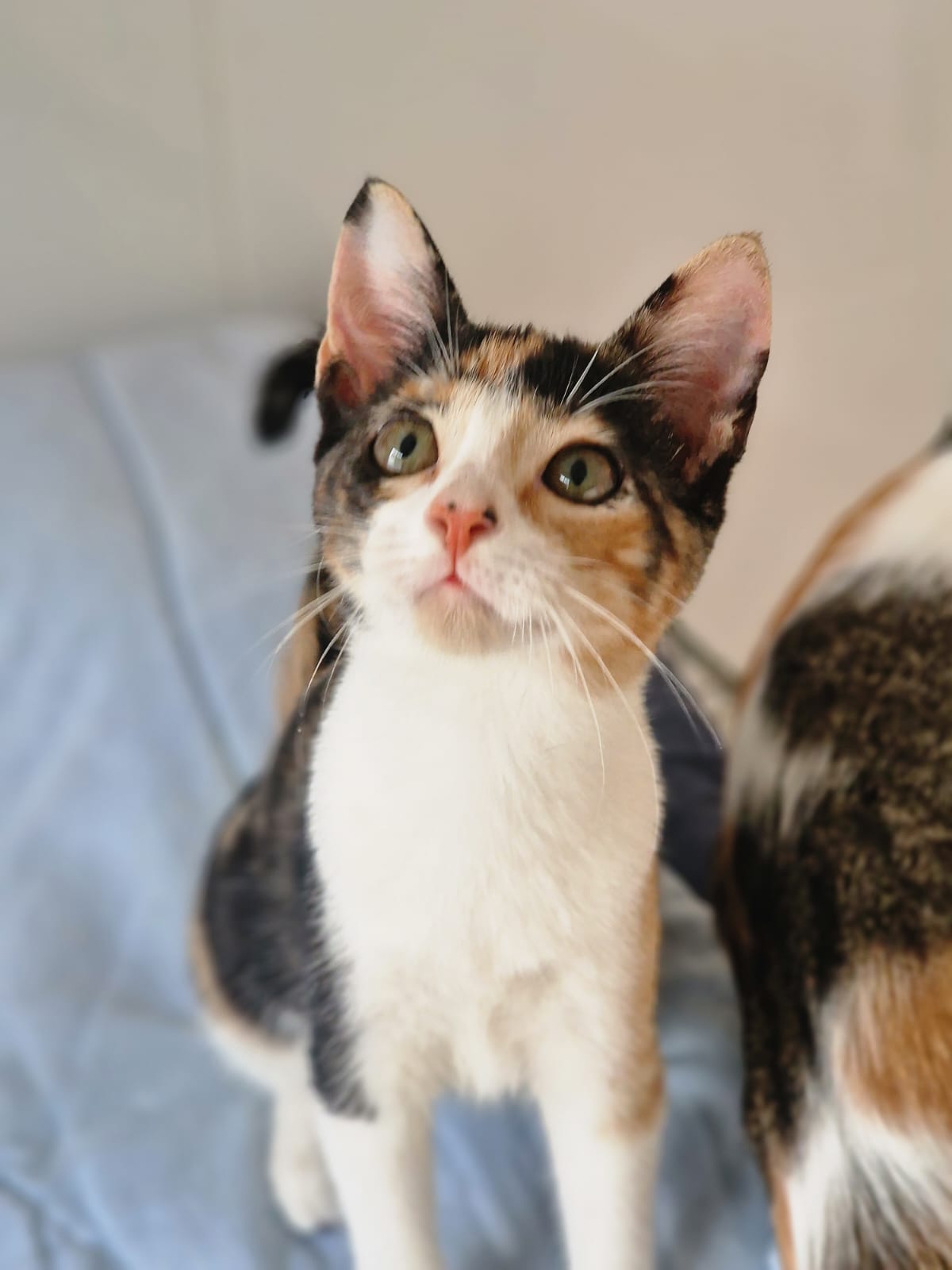 Heidi es una preciosa tricolor con unos ojos increiblemente bellos y conmovedores. Le encanata sentarse en el hombro de su padre de acogida como un loro y adora absolutamente el rascador de carton para gatos, es su juguete favorito.