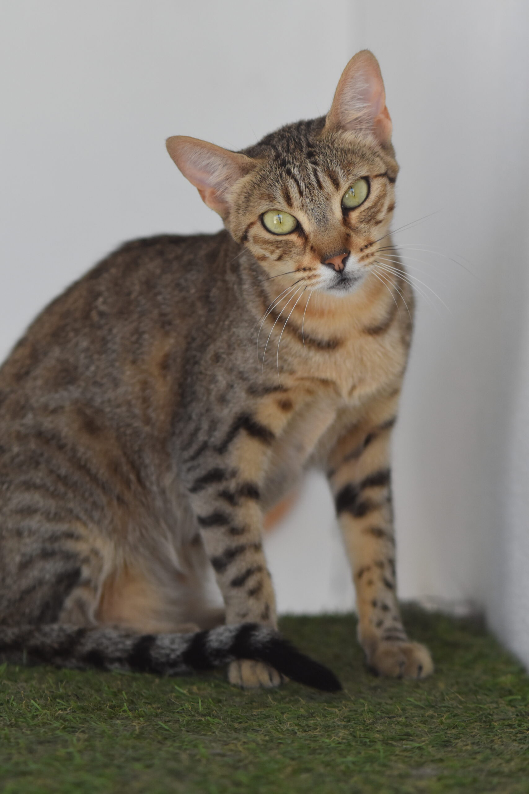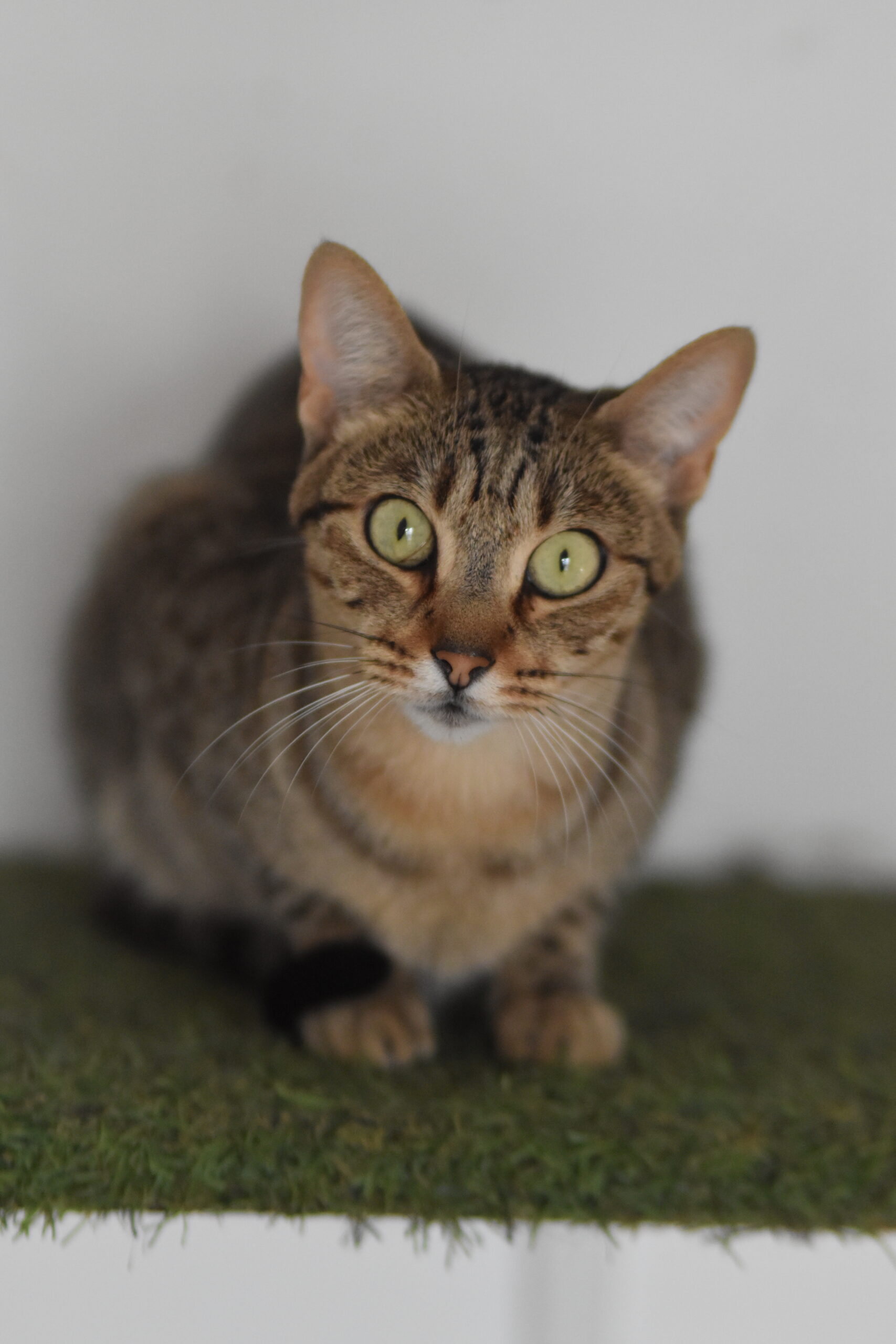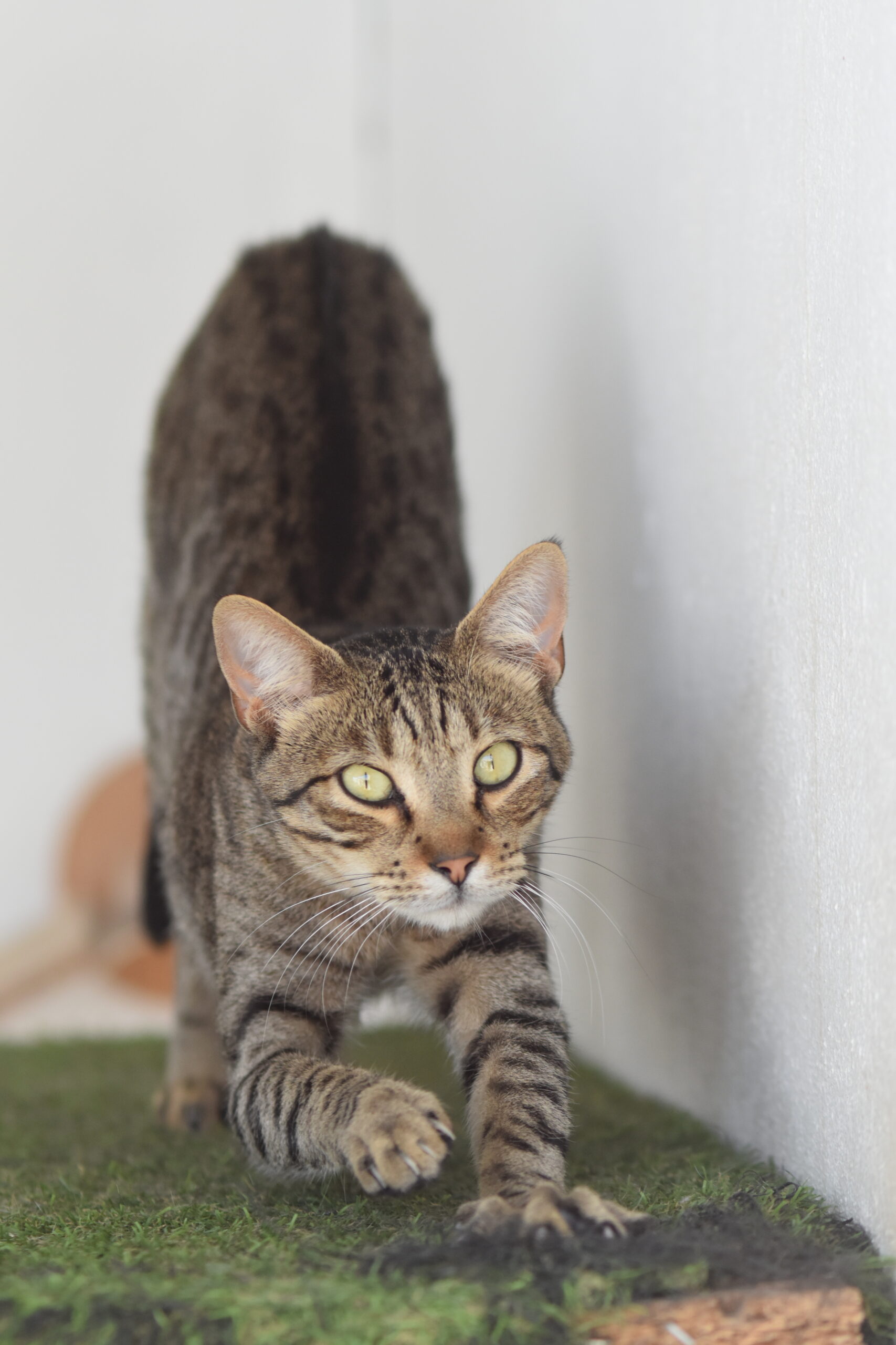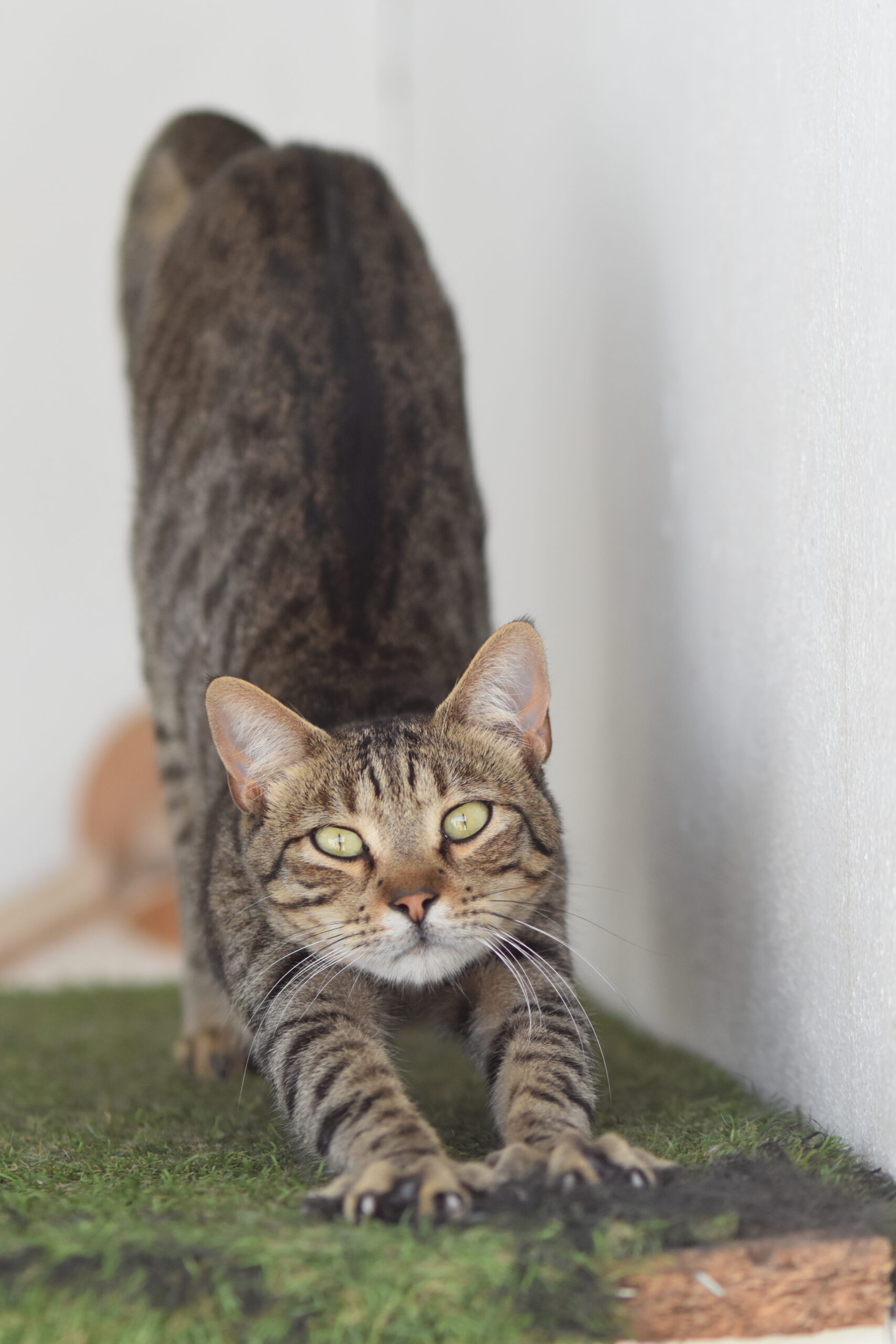 Isidroo es un precioso gato atigrado, con rasgos finos y elegantes y unos ojos verdes que hipnotizan, igual que los de sus hermanos. Es muy sociable y cariñoso, tanto con las personas como con otros gatos: siempre busca compañía, disfruta de los mimos en la barbilla y adora compartir juegos con sus amigos felinos.