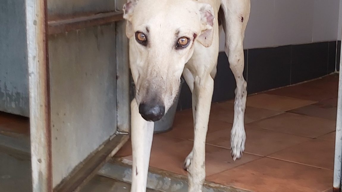 Lleno de heridas, recientes (como la que presenta al lado de uno de sus ojos) y antiguas (repartidas por todo su maltrecho cuerpo); prácticamente en los huesos, desnutrido, deshidratado, plagado de bichos y parásitos…. ¿os podéis hacer una idea de la vida que ha podido llevar este pobre galgo?