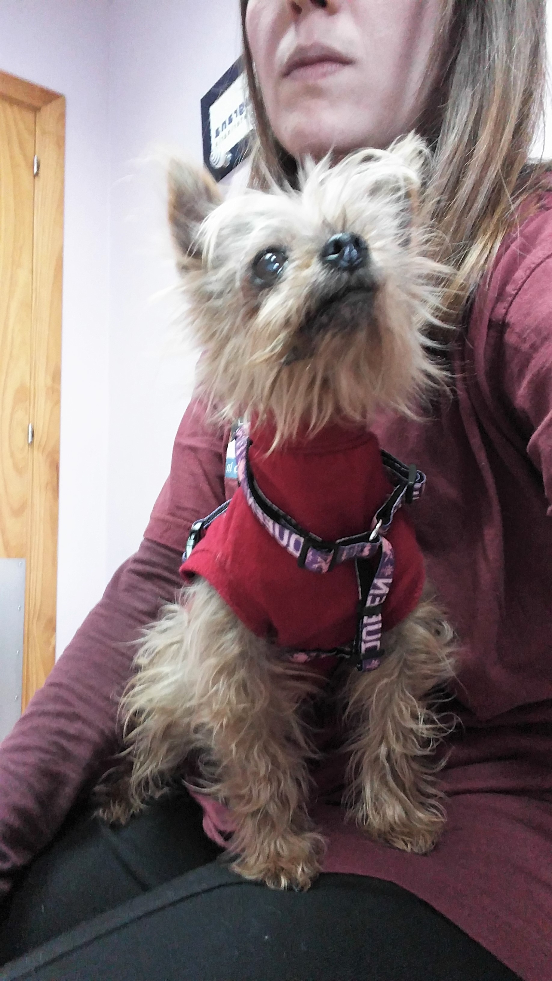 Manuela es una Yorkshire abuelita, muy abuelita, con pérdida de visión, sin apenas dientes en la boca, con bastantes tumores en su cadena mamaria… pero nos encargaremos de que el poco tiempo que le quede, viva como una verdadera reina.