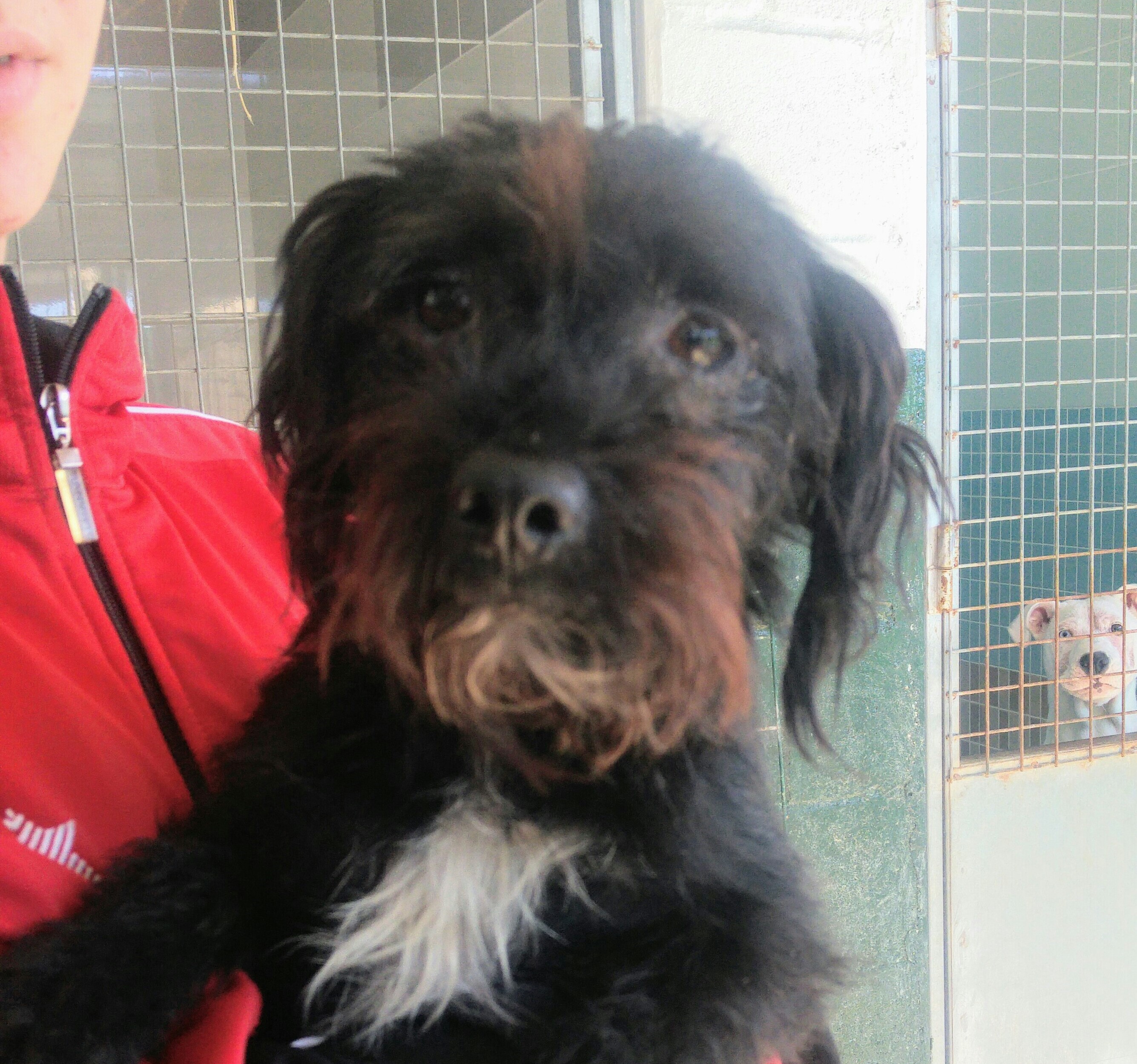 Es un perrito pequeño, de pelito negro algo revuelto, simpatiquísimo y guapísimo que busca constantemente entre los voluntarios mimos y cariño.